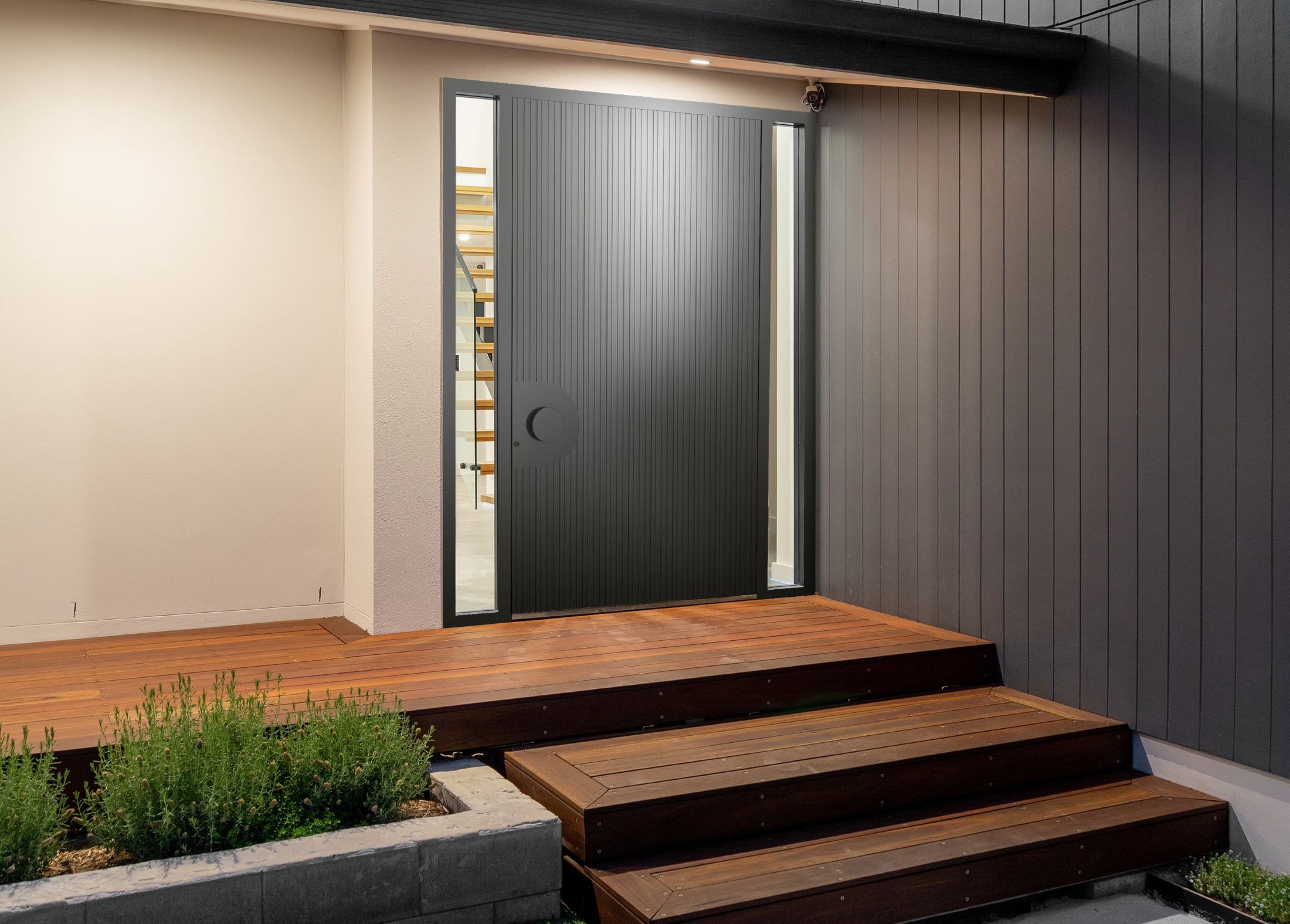 The PIVOT 12 model presents deep milling, set perpendicular to the floor surface. This pattern, characterized by a unique texture, is also distinguished by its decorative design, thanks to being equipped with an elegant round handle. The unusual pattern in a deep shade of black can be adapted to any RAL color scheme, making it easy for customers to match this model with the color of the elevation.